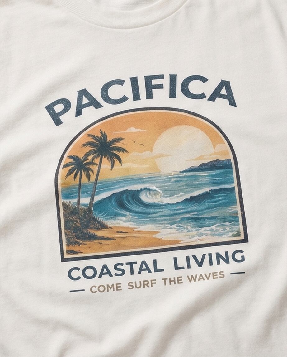 PACIFICAの世界観を象徴する、サンセット×ウェーブのオリジナルグラフィックTシャツ。