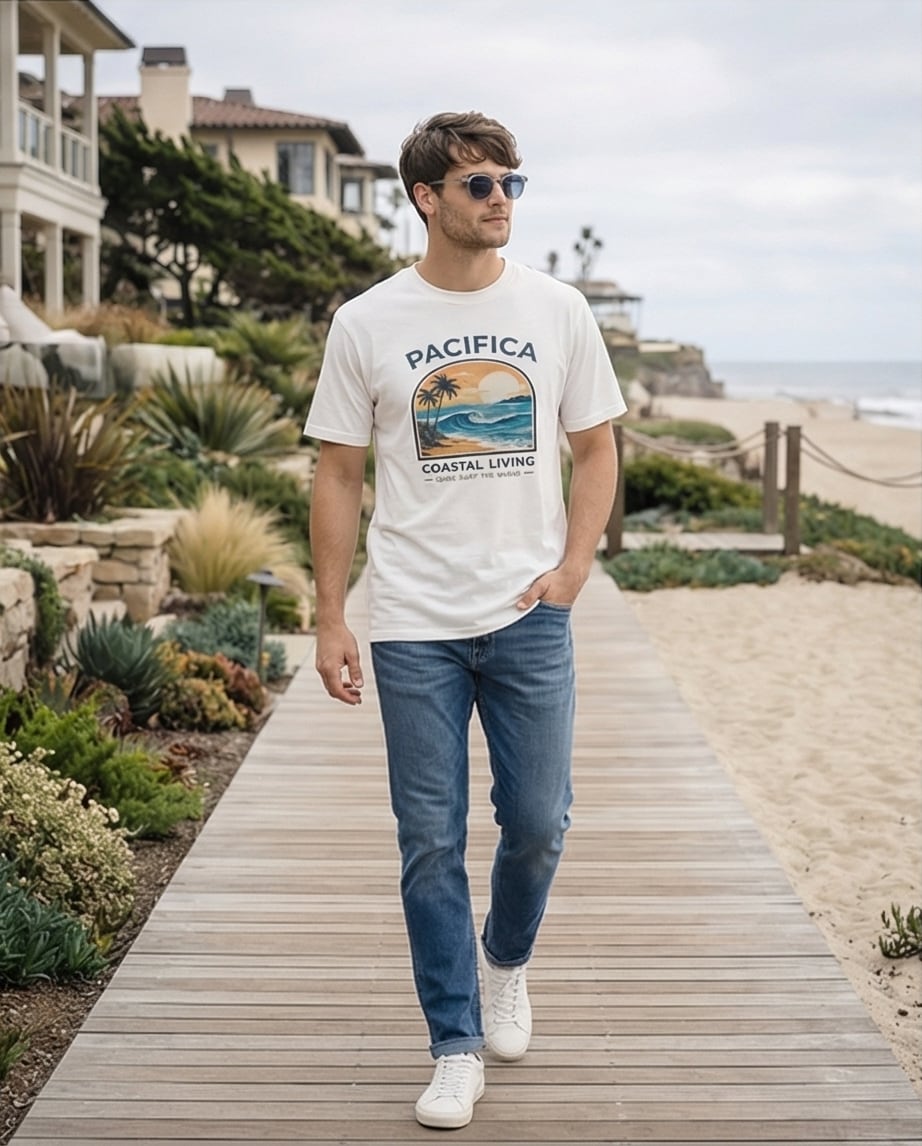 “Coastal Living” のメッセージを胸に、日常へ海の空気を落とし込んだ一枚です。